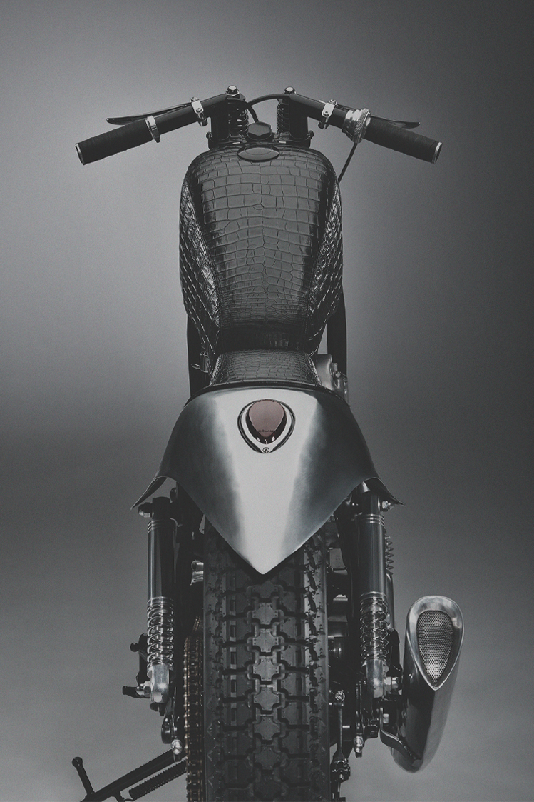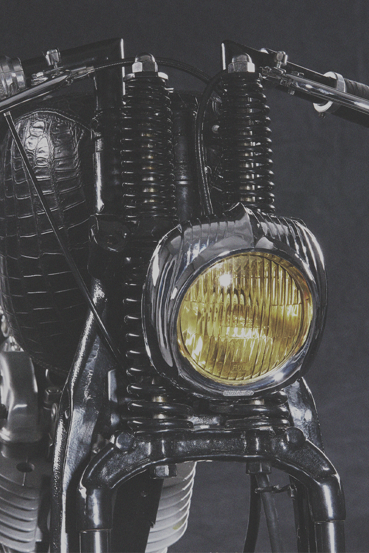When approached by a well respected french curator for an upcoming show, what do you do? You kindly accept and promise to build something the world has never seen before. This was the starting point for Reptilia. We were inspired by 1930’s concept cars and based the overall shape in that ever so elegant S shape that dominated the art deco lines of the past. As we were to be representing Thailand, we decided to use Siamese Croc belly to form the seat and wrap the tank in an elongated manner to highlight the unconventional use of materials and re-define what a motorcycle should feel like. We converted a 1950’s Harley springer as we needed to personify that old and mechanical feel and couple it with the presence that a 1930’s car fog light would convey.