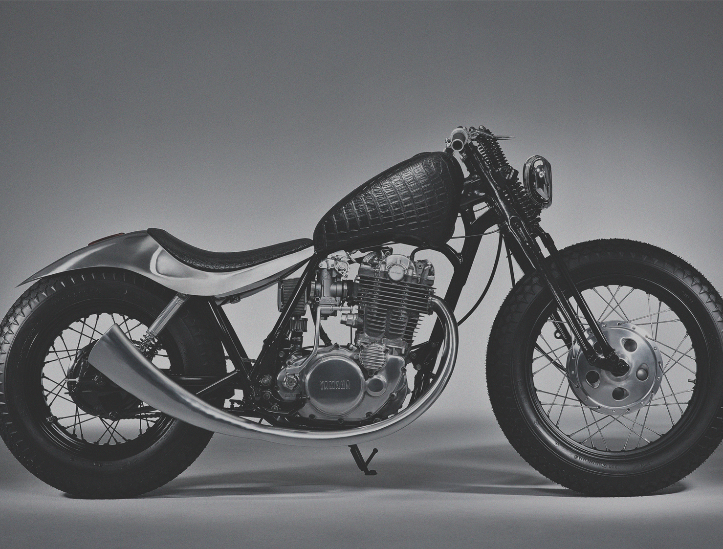 The Bobber ergonomics is pretty much the only modern visual cue for this bike, but should interrupt your visual reference with the horn instrument shaped exhaust that leaves a beautiful melody a true thumper sould. We decided to use firestone ans off road tires to throw off the expected and match the texture of the croc belly for a bit of symmetry.