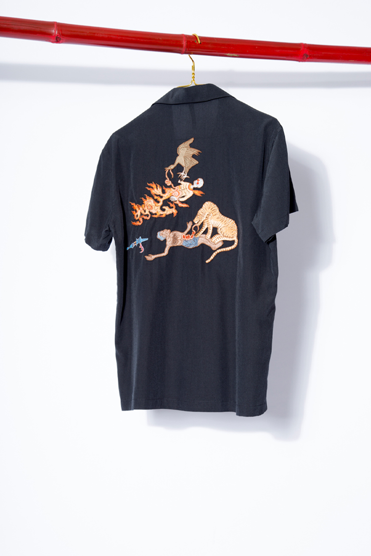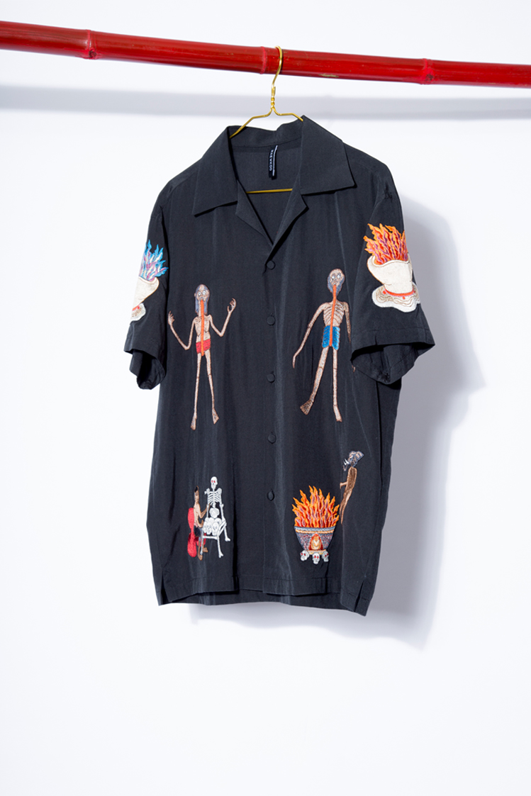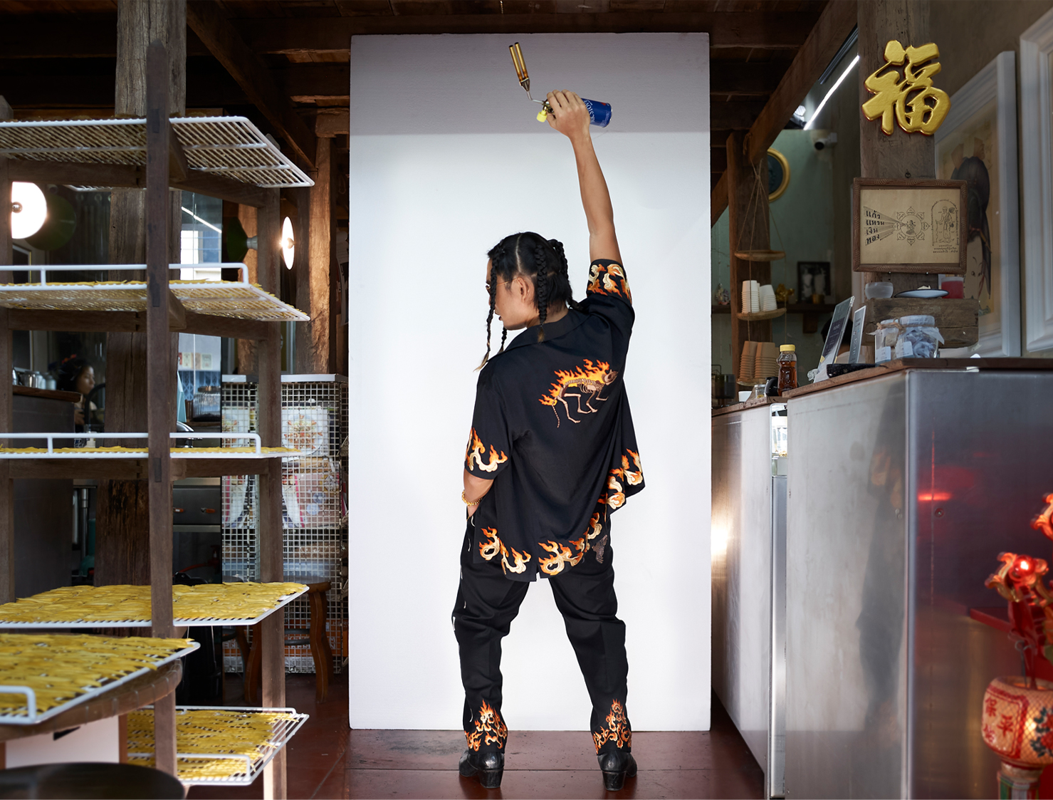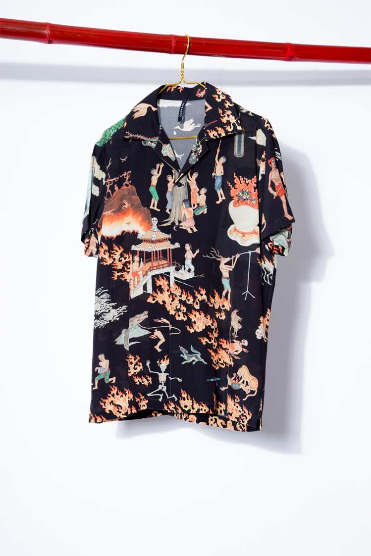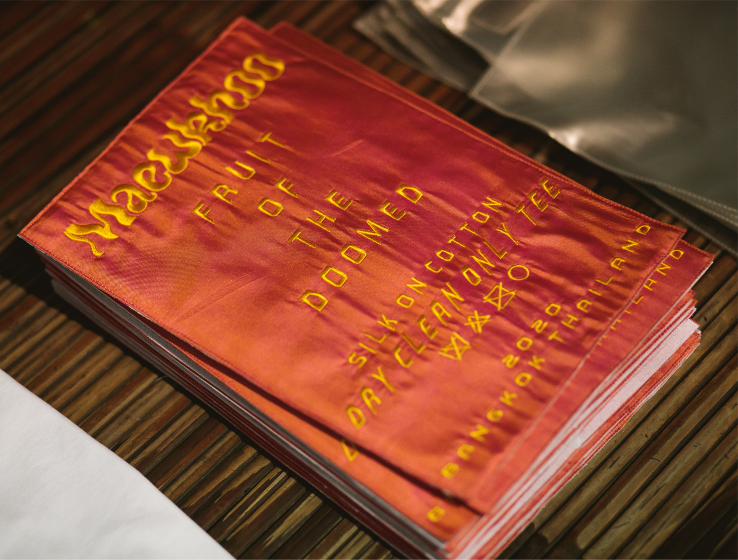 FRUIT OF THE DOOMED: THE FIRST COLLECTION was launched at FV (Fruit and Vegetables) and keeping it casual on Thanon Songwat in Yaowarat (China Town) with our dear friend “O” having directed our film; we styled an ambiience and vibe that celebrated the vibrant people and bumpin open-bar party to launch this thing. Everyone in the audience was expecting a very serious and high-end production film like how seemingly and predictably all instagram brands do so today, instead our film was quirky, had no-budget, and was anything but serious, depicting a social satire between two nouveau riche and rival gangster families strategically forming an alliance through the marriage of the youngest members of their clan (whilst symbolically and gently reminding everyone in the audience that we are all going to burn in the garden of HELL for our greed and impetulance).