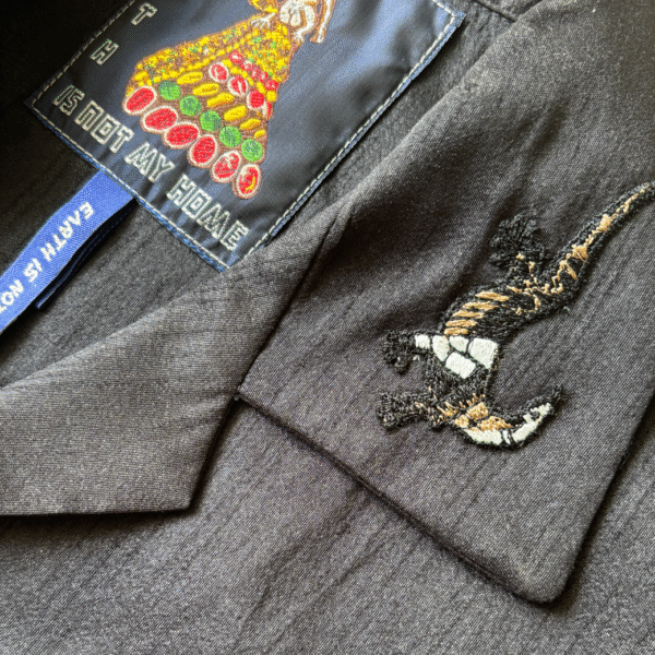 Hand embroidery silk shirt featuring “EARTH IS NOT MY HOME” motifs on the chest. Constructed from hand woven Thai Silk. Crafted in very small batches, in even smaller villages nestled throughout Thailand. Limited 1/1